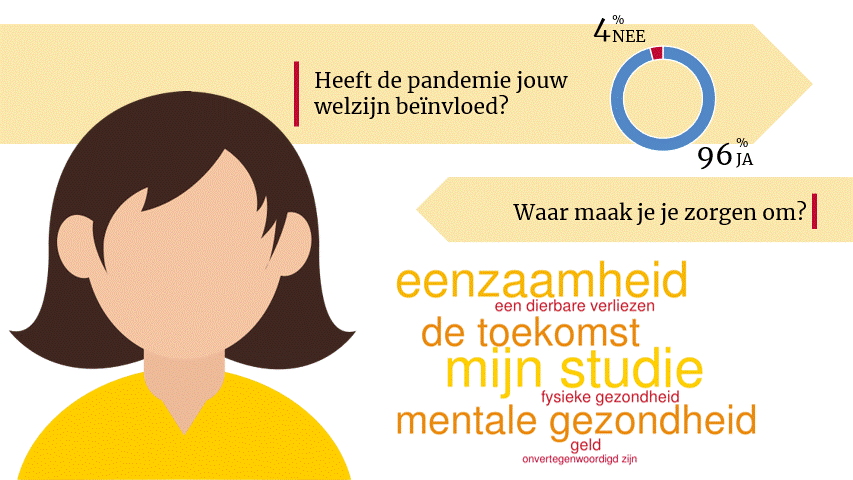 Op mijn vraag of de coronapandemie je welzijn heeft beïnvloed, beantwoordden 96% van de studenten die vraag met "ja". Ze maken zich ook zorgen, over hun studie (26%), sociale leven (24%), mentale gezondheid (18%) en de toekomst (18%). Student Emma laat weten: "Studeren is nu een eenzame ervaring. Het is niet alleen ongezellig, maar het zorgt ook voor het gevoel dat je er alleen voor staat in je studie." Een andere student vertelt: "Ik maak me zorgen of ik mijn studie wel haal dit jaar. Ik kan me slecht focussen en voel me niet verbonden met de mensen van wie ik kan leren."