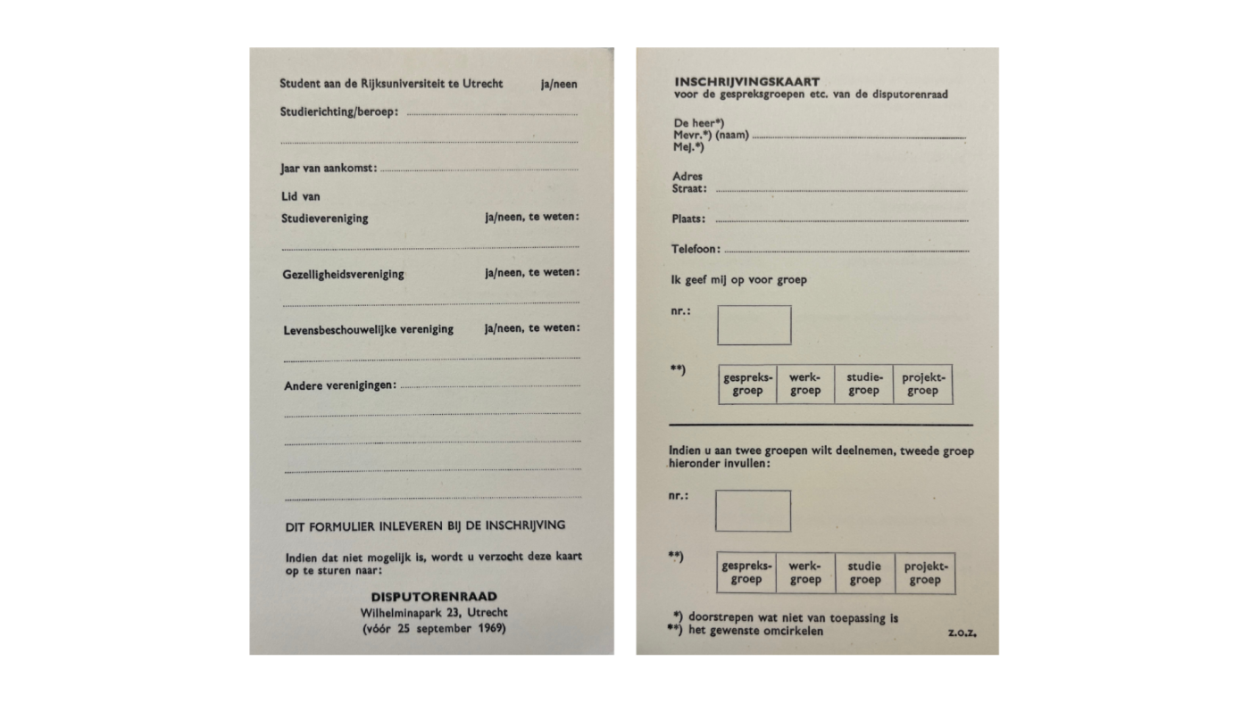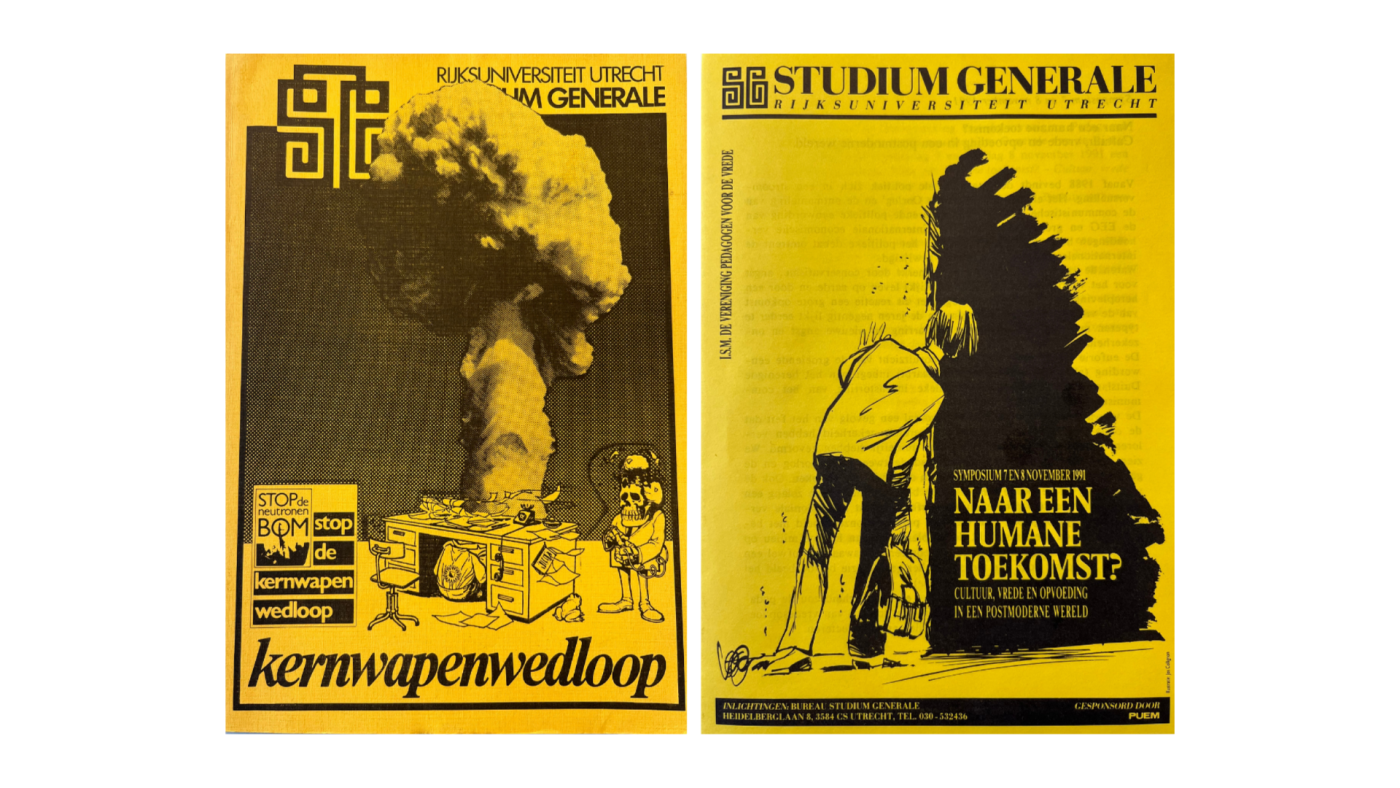 In de archiefkast in de kelder van het Universiteitsmuseum Utrecht kom ik veel gekleurde, met typemachine geschreven brochures tegen. De halfjaarlijkse uitgaves, die lopen van 1968 tot 2026, bevatten herkenbare thema’s en discussies. Een vraag uit 1969: “Wat is de positie en de funktie van V.N. in de huidige wereld? Is deze organisatie in staat een werkelijke bijdrage te leveren tot een vreedzame oplossing van geschillen?” Het had ook een Nieuwsuur-aflevering van vorige week kunnen zijn.