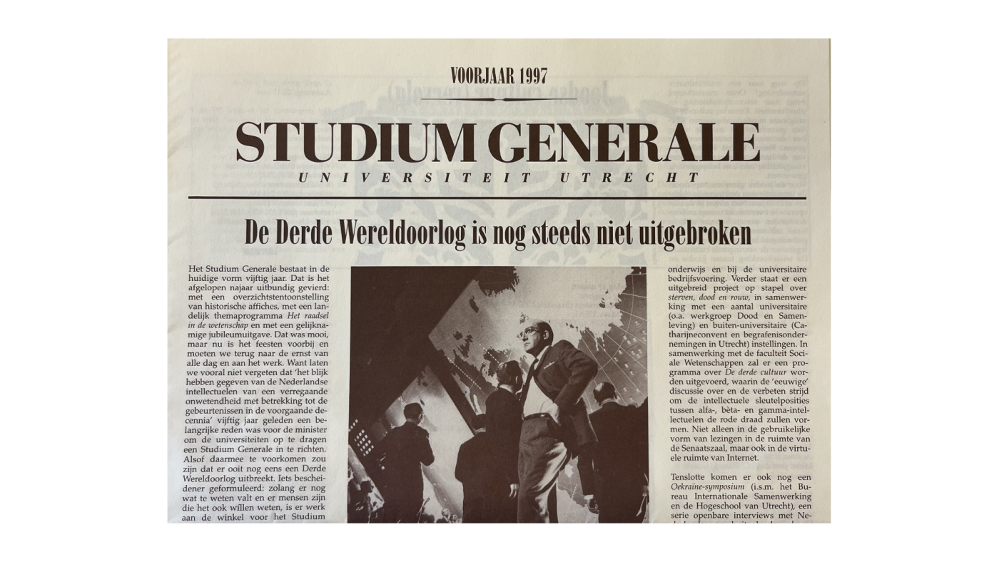Met die grote vraag in mijn achterhoofd duik ik als 23-jarige masterstudent Politieke Geschiedenis en kersverse stagiair bij Studium Generale het archief in. Het eerste wat in het oog springt is de kop van een jubileumkrant: ”De Derde Wereldoorlog is nog steeds niet uitgebroken!”. Een ironische, misschien zelfs cynische constatering, die suggereert dat het doel in elk geval deels is bereikt.